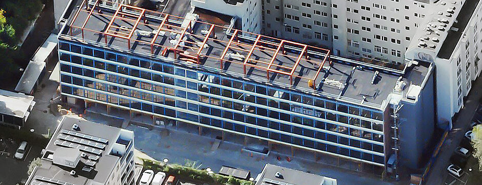 Ein ehemaliges Bürogebäude in Düsseldorf, umgeben von Wohnanlagen und viel Grün.