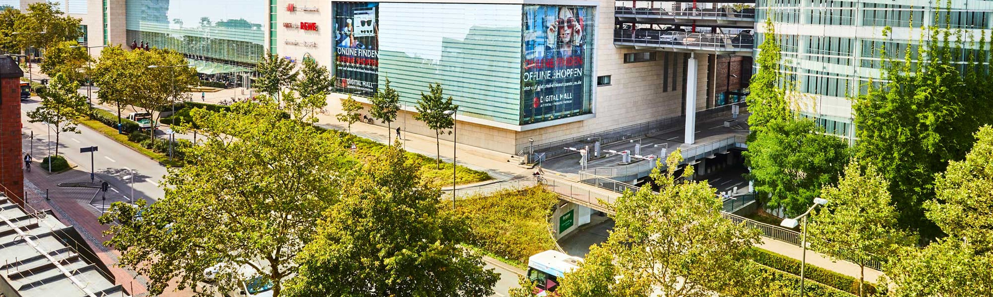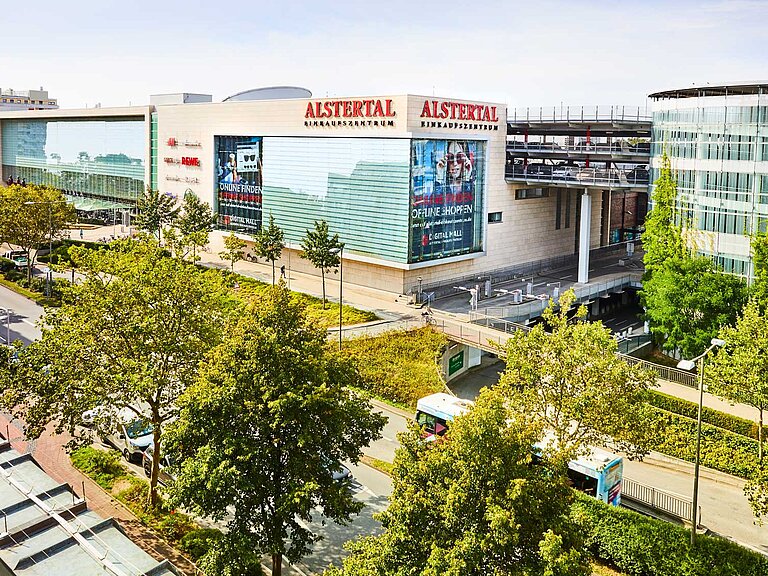 Blick von oben auf das Shoppingcenter Alstertal-Einkaufszentrum in Hamburg.
