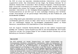 Auch der Zuspruch motivierter Nachwuchskräfte wurde mit zwei weiteren Auszeichnungen bestätigt: der Trendence Trainee-Auszeichnung 2020 für die karrierefördernden ECE-Trainee-Programme und dem Fair Company-Siegel für eine fundierte berufliche Orientierung und faire Behandlung von Hochschul-Praktikanten.