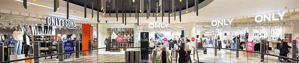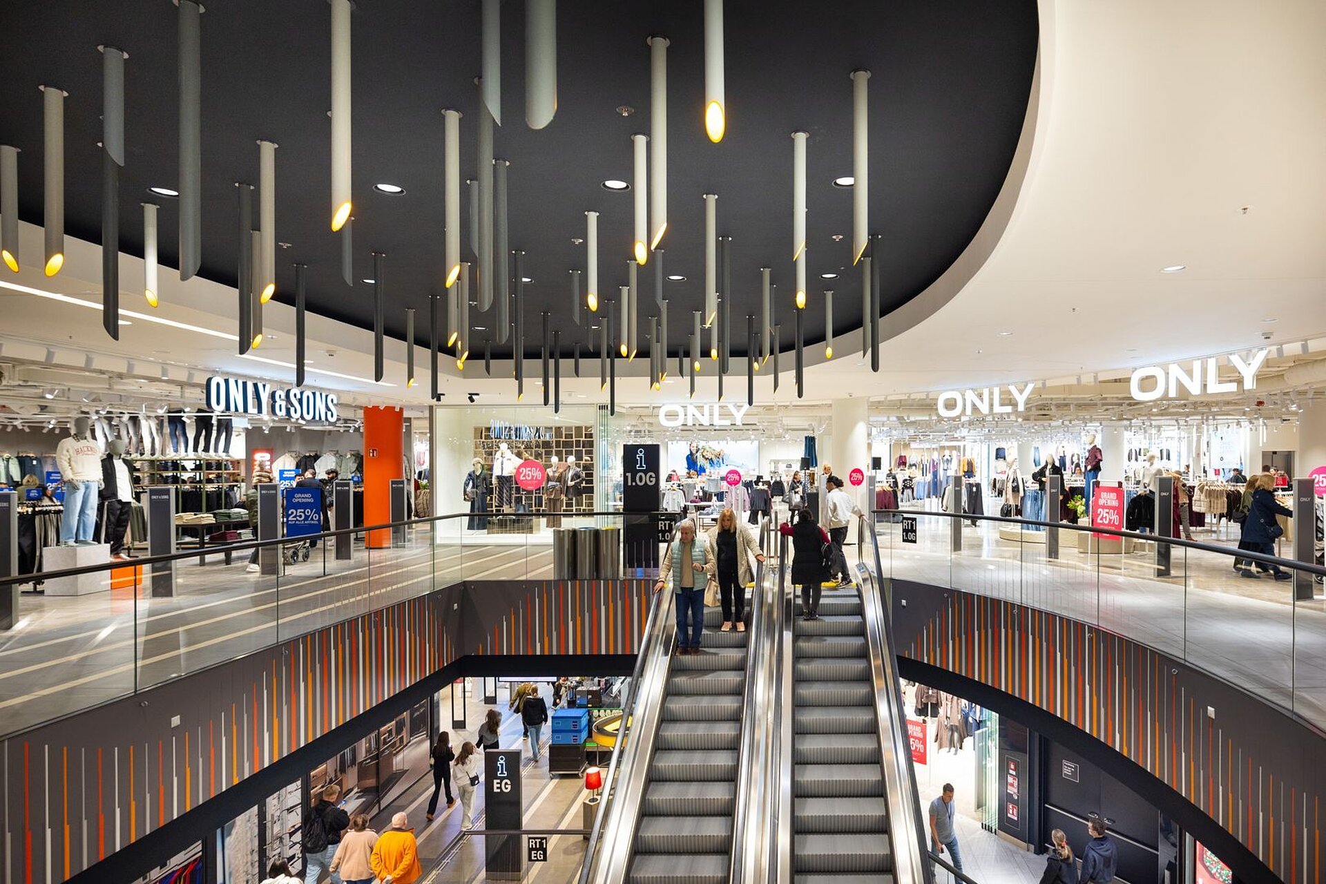 Ein offener Innenbereich eines modernen Kaufhauses mit einer Rolltreppe im Zentrum, umliegenden Verkaufsflächen auf zwei Etagen und vielen beleuchteten Deckenleuchten.