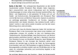 „Mit zahlreichen weiteren potenziellen Mietern sind wir im Gespräch. Wir sind überzeugt, dass sich das gesellschaftliche Leben trotz Corona schrittweise normalisiert und der Potsdamer Platz nach der Krise wieder zu einem Berliner Erlebnisort wird“, so Wambach. Das Ziel von Brookfield Properties am Potsdamer Platz ist es, einen belebten und zeitgemäßen urbanen Ort zu schaffen, an dem sich Städtetouristen, Theaterbesucher, Bürobeschäftigte sowie Berlinerinnen und Berliner gleichermaßen wohl fühlen.