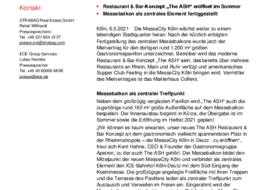 Neben dem großzügig verglasten Pavillon wird „The ASH“ auch die zugehörige rund 160 m² große Außenfläche auf dem Messebalkon bespielen. Der Innenausbau beginnt in Kürze, die Übergabe ist im Sommer sowie die Eröffnung im Herbst 2021 geplant. „Wir können es kaum erwarten, unser neues The ASH Restaurant & Bar Konzept an dem gastronomisch vielleicht spannendsten Platz in der Rheinmetropole – der MesseCity Köln in Deutz - zu eröffnen“, freut sich Kent Hahne, CEO & Founder der Gastronomiegruppe Apeiron, zu der auch The ASH gehört. Der Messebalkon bildet den Mittelpunkt der neuen MesseCity Köln und verbindet als zentrales Element den ICE-Bahnhof Köln-Deutz mit dem Süd-Eingang der Koelnmesse. Die großzügige angelegte Freifläche mit ihren Treppen und die Terrasse des Pavillons laden als zentraler Treffpunkt zum Austausch und Verweilen im Freien ein. Eingerahmt wird der Messebalkon von den beiden zentralen Gebäuden der MesseCity Köln CENTRAAL und SOUTHERN CROSS, die bereits an die Wirtschaftsprüfungsgesellschaft und Unternehmensberatung KPMG sowie an die Hotelbetreiber Motel One und Adina vermietet sind.