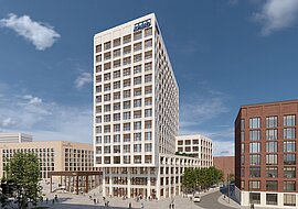 Der neue Unternehmenssitz selbst hebt sich durch seine helle, vom renommierten Architekturbüro Max Dudler gestaltete, Sandsteinfassade deutlich vom umgebungstypischen Ziegelstein ab. 15 Geschosse hoch, steht die zweite Landmarke des Quartiers an exponierter Stelle unmittelbar neben dem Messebalkon. Dieser ist das urbane Herzstück der MesseCity und integriert eine Treppenanlage, die Bahnhof und Messe direkt miteinander verbindet.