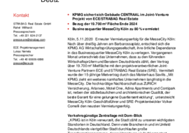 Erneuter Vermietungserfolg für die MesseCity Köln: Nach über dreißig Jahren am Barbarossaplatz, entschied sich die KPMG AG Wirtschaftsprüfungsgesellschaft, ihre örtliche Dependance in das Businessquartier MesseCity Köln zu verlegen. Vergangenen Monat unterschrieb das Unternehmen, dass zu den führenden Wirtschaftsprüfern und Beratern Deutschlands zählt, den Vertrag über 19.700 m² Mietfläche mit den projektverantwortlichen Joint-Venture Partnern ECE und STRABAG Real Estate (SRE). Vermittelt wurde der 15-jährige Mietvertrag durch das Maklerhaus Savills. „Mit KPMG zieht ein weiteres namhaftes Unternehmen langfristig in die MesseCity. Die hochkarätige Nachbarschaft aus ZURICH Versicherung, Arlanxeo, Motel One, Adina Apartments und Contipark ist, neben der städtebaulichen und architektonischen Qualität, der beste Garant für eine gelungene Quartiersentwicklung“, unterstreicht MesseCity Köln-Geschäftsführer und SRE-Projektentwickler Volker Comelli den neusten Vermietungserfolg.