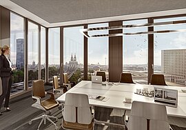 Im Spätherbst 2024 will KPMG ihre neue Dependance mit ca. 900 Arbeitsplätzen beziehen, die Open Space, Zellenbüros und Lounge-Zonen mit integrierten Teeküchen unter ihrem Dach vereint. Außerdem stehen der Beratungsgesellschaft künftig ein hochwertiges Betriebsrestaurant, eine Skybar sowie eine Fitnesszone zur Verfügung. Im Erdgeschoss und 1. Obergeschoss befinden sich Multispace- und Konferenzzonen. Besondere Annehmlichkeiten - neben dem Dom-Blick - sind die direkte Anbindung des Restaurants an die Multispace-Zone sowie dessen Außengastronomie auf dem angrenzenden Messebalkon.