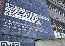 Am Campus des Immobilienunternehmens ECE in Poppenbüttel wurde heute im Beisein von Hamburgs Finanzsenator Dr. Andreas Dressel die weltweit erste stickoxidbindende Textilfassade eingeweiht. Die mit Nanotitanoxid beschichtete Fassade ist an einem Bürohaus angebracht und bindet die schädlichen Stickoxide, die durch die Autoabgase am viel befahrenen „Ring 3“ die Luft verunreinigen. Ziel des Pilotprojekts bei der ECE ist es, neue Möglichkeiten zur Entwicklung von nachhaltigen Gebäudehüllen zu erproben und die innovative Textilfassade unter Praxisbedingungen zu testen. Dafür wird aufwändige digitale Messtechnik installiert und das Projekt von der RWTH Aachen wissenschaftlich begleitet.