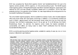 ECE has completed the “Berlin-Süd Logistics Center” and handedtransferred it for use to the logistics service provider, CEVA Logistics, on time and according to plan. The 56,000 square meter logistics center in Königs Wusterhausen near Berlin has been designed, developed and realized by ECE and was already completely leased prior to completion. CEVA has been gradually putting it into operation since October. JLL was responsible as the rental partner for the successful marketing of the property.