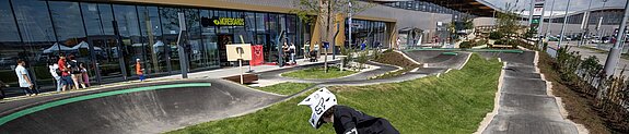 On an area of 5,000 m² in the center and another 3,000 m² in the outdoor area, numerous new retail, product test and experience areas now invite visitors to try out and experience products, including a pump track for bikes, skates and boards, a boulder climbing wall, a trail hiking path, bike test tracks as well as motor skills and play areas for children.