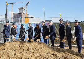 Photo groundbreaking ceremony, participants from left: Lars Hinrichs (founder of UBS DIGITAL ART MUSEUM), Caren Brockmann (Director of DAM), Theresa Twachtmann (Managing Director of HafenCity Hamburg GmbH), Sven Lorenz (Managing Director of Studierendenwerk Hamburg), Katharina Fegebank (Science Senator), Dr. Andreas Dressel (Senator of Finance), Alexander Otto (CEO of ECE Group), Dr. Michael Börner-Kleindienst (Managing Partner of Harmonia Immobilien), Henrie W. Kötter (CEO of ECE Work & Live), Simon Querndt (ECE Head of Development Office & Residential).
