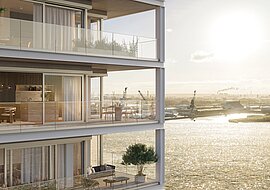 At the same time as the groundbreaking ceremony, sales of the condominiums in TIDE, in the first two residential towers BEAT and PULSE, will start immediately. The apartments offer generously designed living areas and bright, light-flooded rooms with lots of glass and floor-to-ceiling window elements as well as exclusive design with various high-quality equipment lines. Large window fronts as well as spacious loggias and landscaped conservatories allow attractive views of the water in the direction of Baakenhafen and the Elbe.